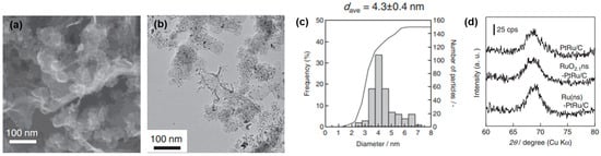 Ru(ns)-PtRu/C: (a) HR-SEM, (b) TEM, (c) and corresponding PtRu particle distribution obtained from (b), and (d) XRD patterns: PtRu/C, RuO2.1 ns-PtRu/C, and Ru(ns)-PtRu/C. Reproduced with permission. Copyright 2016, IOP [75].