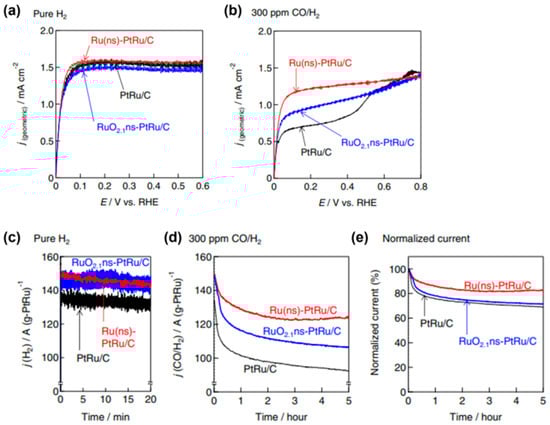 Hydrodynamic voltammograms saturated with (a) pure H2, (b) 300 ppm CO/H2 for PtRu/C (black), RuO2.1 ns-PtRu/C (blue), and Ru(ns)-PtRu/C (red) with 400 rpm in 0.1 HCIO. Chronoamperograms saturated with (c) pure H2, (d) 300 ppm He/CO for PtRu/C (black), RuOz,ns-PtRu/C (blue), and Ru(ns)-PtRu/C (red) with 400 rpm in 0.1 M HCIO at 20 mV vs. RHE., and (e) normalized current of (b). Reproduced with permission. Copyright 2016, IOP [75].