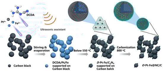 Lee et al. [54] reported research on fabricating a PtRuNi/C ternary electrocatalyst with a composition gradient shell using a combination of high-temperature heat treatment and the polydopamine (PDA) protective coating method [55,56,57]. Their work highlighted the effectiveness of protective coating layers in creating core–shell structures with a Pt-rich shell for optimal ORR catalysis. The protective coating method was found to prevent particle sintering during high-temperature treatment (600–800 °C).