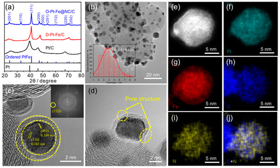 The XRD patterns (Figure 9b) of FePt@PtBi and FePt revealed characteristic peaks for tetragonal FePt, intermetallic phases, and ordered L10-FePt, with similar (110)/(111) intensity ratios indicating highly ordered crystal structures. High angle annular dark field imaging-STEM (HAADF-STEM) images (Figure 9c) of FePt@PtBi depicted a 2–3 layer-thick PtBi shell covering the ordered intermetallic core with (110) planes of L10-FePt, and the FFT patterns confirmed the core’s face-centered tetragonal (fct) structure.