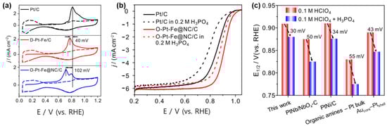 In contrast to FePhen@MOF-ArNH3 (Figure 3a), the introduction of only 10 mM H3PO4 into the electrolyte for Pt/C led to a slight decrease in the limiting current magnitude. This phenomenon suggests a hindrance to O2 reaching the electrode surface. Furthermore, compared with the profile without H3PO4, the half-wave potential (E1/2), a pseudo-kinetic parameter reflecting ORR activity, shifted cathodically by approximately 150 mV (0.87 vs. 0.72 V).