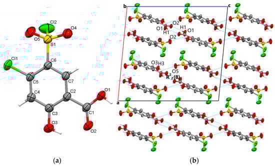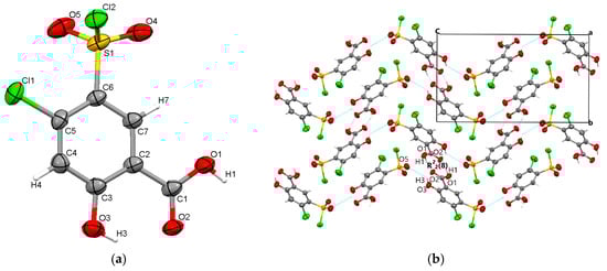 The starting form of 4-chloro-5-chlorosulfonylsalicylic acid crystallizes centrosymmetrically in the monoclinic C2/c space group, with one molecule in the asymmetric unit (Figure 2a). In the crystal, the molecules are linked via mutual O1-H1···O2 carboxyl···carboxyl hydrogen bonds (1.656 Å), which bridge molecular dimers and form a R22(8) graph set motif. Along the b-axis direction, the molecules are linked via C4-H4···O4 interactions (2.441 Å) between the phenyl ring and the O4 oxygen of the sulfonyl group and are located in the same plane. The molecular layers are further connected via O3-H3···O5 (2.485 Å) hydrogen bonds between the hydroxyl group and the O5 sulfonyl oxygen. The crystal packing perspective of polymorph 1 is depicted in Figure 2b.