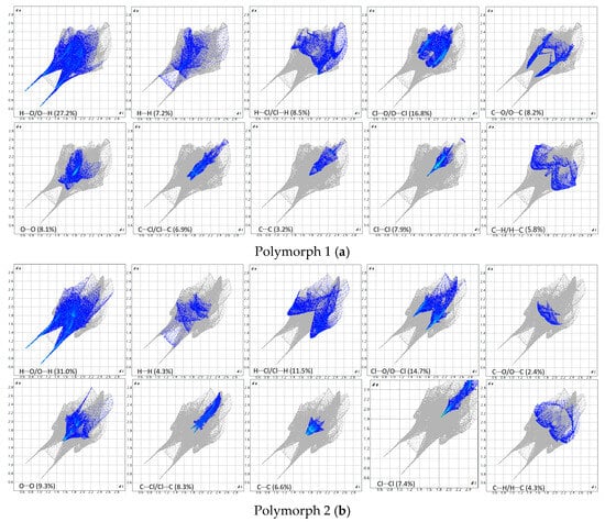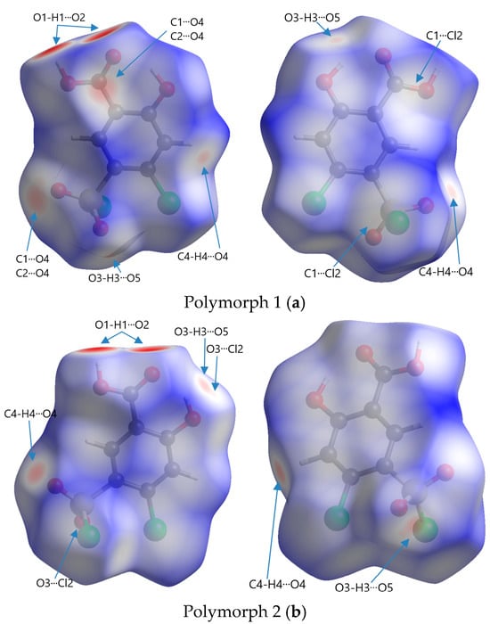 The Hirshfeld surface analysis was carried out to gain a deeper understanding of the contact interactions in the crystal structures of the polymorphs. The analysis reveals both similarities and differences among the polymorphs in terms of distinct contact features (Table 2), as demonstrated by the corresponding dnorm-surface mappings in Figure 6.