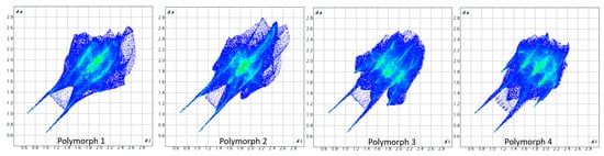 The molecular packing similarity analysis for the four polymorphs was performed using the Mercury software package (Version 2023 3.0) [30], which calculated positional differences between a cluster of 15 molecules in each crystal [31]. The parameters were set to include only molecules with a positional variation within 20% for both distances and angles, while molecules with deviations greater than 20% were excluded. Hydrogen atom positions were omitted, and inversions were allowed during the comparison. The results show that polymorphs 1 and 2 have the highest packing similarity, with five out of 15 molecules overlapping and an RMS deviation of 0.348. Polymorphs 2 and 4 also exhibit a good overlap for three of the 15 molecules, with an RMS deviation of 0.106, while the remaining molecules align well only for the molecular pairs that form the R22(8) synthons. The molecular overlap is displayed in Figure S1 (Supplementary Materials).