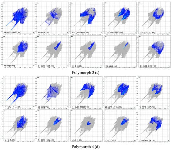 Breakdown of the fingerprint plots in individual contributions. Polymorph 1 (a); Polymorph 2 (b); Polymorph 3 (c); Polymorph 4 (d).