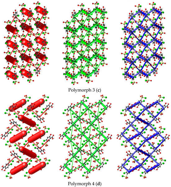 Crystal packing views over a domain of 2 × 2 × 2 unit cells considering a scale factor of 100 and an energy cut-off of 8 kJ/mol, illustrating the electrostatic term (red), dispersion energy (green), and the overall energy frameworks (blue) of the polymorphs. The relative magnitude of interaction energies is proportional to the cylindrical radius. Polymorph 1 (a); Polymorph 2 (b); Polymorph 3 (c); Polymorph 4 (d).