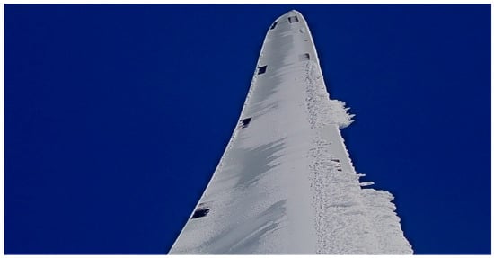 Atmospheric icing occurs when ice or snow builds up on surfaces exposed to the surrounding air; this accumulation causes problems for the structure and function of objects and infrastructure. Broadly, atmospheric icing is typically classified into two primary types: “in-cloud icing”, which includes rime ice and glaze (Figure 1), and “precipitation icing”. Rime ice is primarily solidified supercooled droplets of water that typically can be formed at cold temperatures. Glazed ice consists of incompletely frozen supercooled droplets of water and is created at temperatures slightly below water’s freezing point; it is denser than rime ice and exhibits a polished appearance. Mixed ice develops within the middle range of freezing temperatures, usually between 0 and −20 °C and even as low as −40 °C under extreme conditions [1,2,3]. Additionally, icing creates significant obstacles that hinder the optimal utilization of renewable energy sources, like wind power [4].
