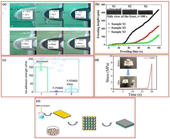 (a) The results of icing test for three different GFRP blades: one uncoated, one coated with MoS2/PDMS nanomaterials, and one coated with MoS2/ZnO/PDMS nanomaterials at −10 °C, 5 m/s and −15 °C, 10 m/s for 3 min [71]; (b) frosting morphology of hydrophilic (S1), hydrophobic (S2), and superhydrophobic (S3) surfaces at −12 °C and 100 s [72]; (c) τice of coated aluminium and untreated bare aluminium substrates [73]; (d) The electronic tensile testing machine showed the coating/substrate interfacial strength [74]; (e) Preparation process of ZnO/SiO2 multi-scale superhydrophobic coating [75].