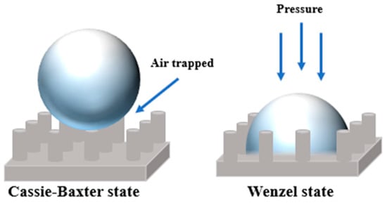 SHS has been presented as the first generation of icephobic materials to promote the rapid elimination of water droplets before they freeze and thereby delay ice nucleation. However, the air pockets that contribute to their hydrophobic properties are vulnerable to disruption in harsh environments, which can compromise the surface structure. As a result, this leads to increased adhesion between the surface and water, reducing the material’s ability to repel fluids and diminishing its effectiveness as an icephobic coating. Furthermore, in wind turbine icing conditions, water droplets can impact the blade surface at high speeds, reaching up to approximately 90 m/s near the blade tips [43]. These water droplets that hit the surface can easily penetrate the texture, causing a shift from the “Cassie–Baxter” state to the “fully-wetted Wenzel” state (Figure 4) [76].