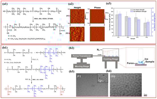 (a1) PDMS-b-PFA block copolymers preparation, (a2) AFM topography and phase photographs of the PDMS-b-PFA coatings (area of 3 μm × 3 μm), (a3) Ice adhesion and τice s of the PDMS-b-PFA coated on Al substrates [111]. (b1) PMTFPS–b-polyacrylate copolymers preparation, (b2) τice measurement setup, (b3,b4) TEM images of PMTFPS–b-polyacrylate on Al plates [115].