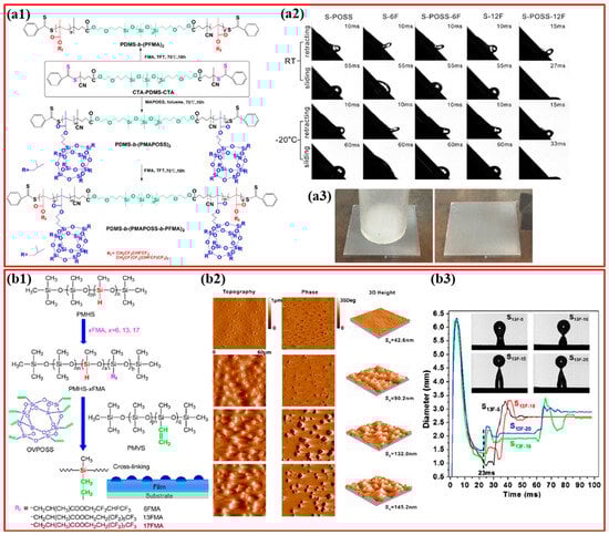 Yuan et al. [116] prepared POSS-containing fluorosilicone multi-block methacrylate copolymers (PDMS-b-(PMAPOSS-b-PFMA)2) using RAFT technique. They used methacryloisobutylPOSS (MAPOSS) with hexafluorobutyl methacrylate (HFBMA) or dodecafluoroheptyl methacrylate (DFHMA) and a dithiobenzoate-terminated PDMS as a macro-RAFT chain transfer agent. They observed that compared to PHFBMA, PDFHMA chains having longer fluorinated functionalities migrated more readily onto the surface. Adding PMAPOSS segments improved surface roughness and reduced the τice from 361 to 264 kPa. The multi-block PDMS-b-(PMAPOSS-b-PDFHMA)2 coating had a fluorine-rich surface, a receding CA of 103.8 ± 0.5°, and a CAH of 8.7 ± 1.4°. Water droplets could effortlessly slide off the tilted coating (45°) at −20 °C. After the τice experiment, the absence of remaining ice on the S-POSS-12F (F/Si = 2.34) demonstrated a loose ice assembly at the ice–coating interface (Figure 7(a3)).