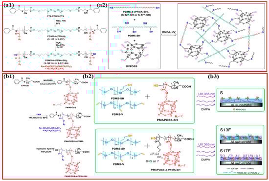 (a1) Preparation of PDMS-b-(PFMA)2 and PDMS-b-(PFMA-SH)2 copolymers, (a2) Synthesis of photocrosslinkable fluorosilicone triblock methacrylate copolymer coatings [152]. (b1) Preparation of thiol-modified PMAPOSS-b-PFMA-SH via RAFT approach, (b2) Schematic illustration of the development of the icephobic coating from photocrosslinkable POSS-fluorinated methacrylate diblock copolymers, (b3) PMAPOSS aggregates migrated to the surface throughout the spin coating process on Al and photocrosslinking in PMAPOSS-SH (S) comprising film [120].