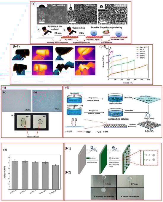 Lu et al. [180] used a perfluorosilane fluorinated ethanol solution to coat TiO2 nanoparticles and create a superhydrophobic coating by spraying or brushing it onto the substrate. The WCA remained within 156° to 168° after 40 abrasion cycles, indicating the maintenance of superhydrophobicity after mechanical abrasion. No other tests were performed to characterize its superhydrophobicity. Son et al. [181] developed a highly impact-resistant and recyclable “polyamide 6 (PA 6)-based carbon fiber–reinforced thermoplastic (CFRTP)” using a reactive liquid molding process. However, the mechanical properties degraded when external components were used in a humid environment. They resolved this issue by coating the PA 6-based CFRTP with fluorinated polydopamine (f-PDA) using the thermoplastic resin transfer molding process. The resulting coating exhibited improved water stability, reduced the surface energy by 49%, and demonstrated an anti-icing performance. This anti-icing ability remained effective for 30 min. Additionally, the f-PDA coating retained its integrity after being exposed to temperatures between −30 and 210 °C, as well as undergoing a sandpaper wear test for 200 cycles (CA > 85°).