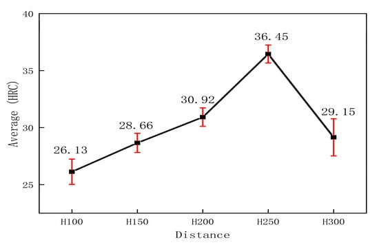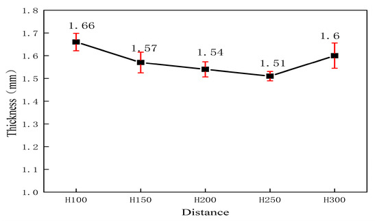 The substrate material used in this experiment was 45# steel (Table 1), with dimensions of 400 mm × 100 mm × 8 mm. The substrate material was cleaned with acetone to remove surface oil stains and rust. Then, brown corundum particles were used for sandblasting to ensure that the surface roughness of the substrate material reached Ra2.5 or above. This step improves the bonding strength between the coating and the substrate material. After sandblasting the substrate, arc spraying was performed. The equipment used was a QD8-400 arc spraying machine produced by Shanghai Eurasia Spray Machinery Co., Ltd. and a Yaskawa robot. As shown in Figure 1, the arc spraying machine allows the adjustment of parameters such as wire feeding speed and spraying current. The wires used in the experiment were 1Cr18Ni9Ti and Monel alloys, and their chemical compositions are shown in Table 2. The diameter of both wires was 2.0 mm, the test filaments were sprayed according to the ratio of 1:1, and the compressed air pressure for spraying was 0.65 MPa. The average thickness of the sprayed coating is 1.5 mm, and the average thickness distribution of the five sprayed distances is shown in Figure 2. Samples were prepared using the process parameters in Table 3, with experiments conducted at five different spraying distances. The distance between the nozzle of the arc spraying machine and the substrate surface was set at 100 mm, 150 mm, 200 mm, 250 mm, and 300 mm. They were represented as H100, H150, H200, H250, and H300, respectively, in the following figures. These distances were used to explore the optimal spraying effect.