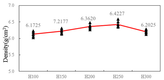 The density of the arc-sprayed coating samples varies compared to the density of the original wire material. Coating density can reflect the compactness of the coating to a certain extent. The higher the density, the more compact the coating and the lower the porosity [23]. The variation in sample density with spraying distance is shown in Figure 3. When the spraying distance is 100 mm, the sample density reaches the minimum value of 6.1257 g/cm3. As the spraying distance increases, the sample density gradually increases, reaching a maximum value of 6.4227 g/cm3 at a spraying distance of 250 mm. After that, the density decreases gradually. When the distance between the spray nozzle and the substrate surface is too close, the metal droplets are not sufficiently atomized due to the effect of the high-speed airflow. Large metal droplets attach to the substrate surface, leading to particle accumulation. Conversely, the metal droplets are sufficiently atomized when the nozzle is too far from the substrate. However, they experience a longer exposure time in the air, causing their temperature to drop and their adhesion to weaken. This results in the formation of pores between the metal droplets, reducing the density of the sprayed coating.