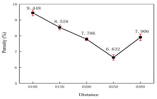 By scanning the sections of sprayed coatings with different heights, five SEM images were taken for each section. The coating sections were analyzed by Image Pro Plus 6.0 software, and the average value was calculated. The porosity distribution of coatings with different spraying distances was obtained, as shown in Figure 7.