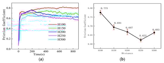 As shown in Figure 8, a and b are the curves of the friction coefficient of the coating of the arc-sprayed sample as a function of time. The polished sample surface is relatively smooth in the initial friction stage, resulting in a low friction coefficient. As dry friction continues, the friction coefficient rapidly increases due to the formation of wear particles and other substances during the friction process. These particles create dents on the coating surface, increasing the contact area between the wear ball and the coating. Over time, the wear particles gradually fill in the dents, further increasing the surface friction coefficient. The friction coefficient is closely related to the material’s physical properties. The lower the friction coefficient, the better the material’s wear resistance. After 200 s, friction enters the steady wear stage, and the friction coefficient remains relatively stable. Figure 6a shows the variation of the friction coefficient during the testing process, while Figure 6b shows the variation in friction coefficients for different spraying distances. When the spraying distance is 100 mm, the friction coefficient reaches a maximum value of 0.7752. As the spraying distance increases, the friction coefficient gradually decreases. It reaches a minimum of 0.6214 at 250 mm. After that, it rises again.