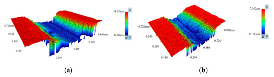 Figure 9 shows the three-dimensional morphology of the abrasion marks of five spray distance coatings after friction and wear tests. It can be seen that the shape of the abrasion marks of the five coatings is close to one another, showing a large abrasion mark width and abrasion mark depth. The wear interiors of the five coatings are not smooth, with many obvious bumps and pits. Among them, A coating has the largest abrasion mark width and depth, and exhibits the largest abrasion volume, the worst abrasion resistance, and the worst structural integrity under friction load. D coating is analyzed in comparison with the other coatings. It has a shallower depth of abrasion mark, the smallest width of abrasion mark, the smallest abrasion volume, and the best structural integrity under friction load, which reflects the good friction and abrasion resistance performance. The spraying distance of 250 mm showed the best wear performance of the coating.