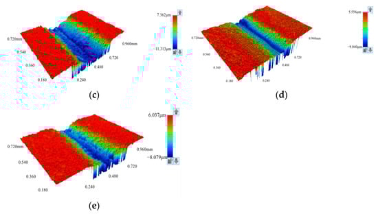 3D Morphology of Abrasion Marks of Coatings. (a) Spray distance 100 mm; (b) Spray distance 150 mm; (c) Spray distance 200 mm; (d) Spray distance 250 mm; (e) Spray distance 300 mm.