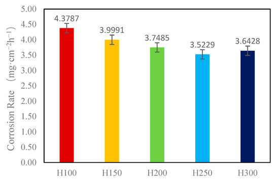 Figure 12 shows the corrosion rate of arc-sprayed coatings at five different spraying distances. The coatings were immersed in a 5% sulfuric acid solution. The main components of these sprayed samples include Fe, Cu, and Ni alloys. According to the corrosion performance tests of Ni-Cu alloys in air reported in the literature [32], nickel-copper alloys exhibit the fastest corrosion rate in a 5% sulfuric acid solution. The surface of the coatings primarily consists of Fe, Cu, and Ni compounds, and when reacting with 5% sulfuric acid, the oxide phases on the surface react first. The sample with a spraying distance of 100 mm had the fastest corrosion rate of 4.3787 mg·cm−2·h−1, while the sample with a spraying distance of 250 mm had the slowest corrosion rate of 3.5229 mg·cm−2·h−1.