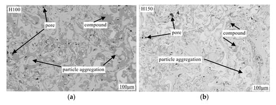 Figure 6 is a scanning electron microscope photograph of the coating section when the spraying distance is 100 mm and 250 mm. It can be seen that the coating presents a typical compact layered structure, which is composed of flattened particles, oxides, and pores. The reason for the layered structure is that the huge energy generated when the wires at both ends are short-circuited makes the wires melt and form droplets. The droplets are atomized by high-pressure gas, and the small particles formed after instant atomization quickly hit the substrate surface, spreading and solidifying to form a layered structure. The whole section is mainly composed of oxides, large particle accumulation, etc. The existence of oxide phase is caused by the inevitable contact reaction between part of the droplet surface and oxygen in the atmosphere during the spraying process, and the oxide phase formed by these reactions will affect the spreading of the droplet to a certain extent, and then affect the continuity of the coating, forming pores or holes [24].