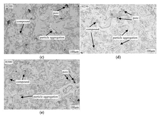 The microstructure of the arc-sprayed coating samples was observed, as shown in Figure 5a–e. The surface of the alloy coating is rough with obvious ups and downs. The roughness of the five coating surfaces is different, and the roughness of the surface in Figure 5d is more uniform than that of other coating surfaces. During arc spraying, the wire melts due to short-circuit heating. The molten droplets are propelled onto the substrate surface under the impact of high-speed airflow. The droplets rapidly spread out and gradually deposit, forming flattened particles. These flattened particles overlap layer by layer, forming a tight lamellar structure and particle accumulation. The flat particles are stacked layer by layer and finally form a compact sheet structure and particle accumulation structure, which are closely attached to the substrate surface and play a good shielding role, as shown in Figure 5f.