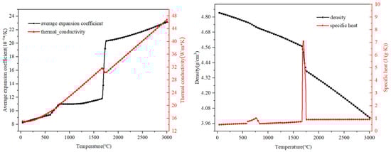 Due to the large laser energy density and short acting time of the SLM process, it is prone to generating large temperature gradients and stress concentrations, leading to uneven stress distribution in the sample [21]. Hence, a coupled analysis of the temperature field and stress is necessary for simulating the SLM forming process. This study utilizes a three-dimensional finite element model (FEM) that employs a sequentially coupled thermal–mechanical approach to investigate the evolution of both thermal and residual stress during the SLM process of binary Ti-Mo alloys. The temperature-dependent values of the average expansion coefficient, thermal conductivity, density, and specific heat are reported in Figure 1.