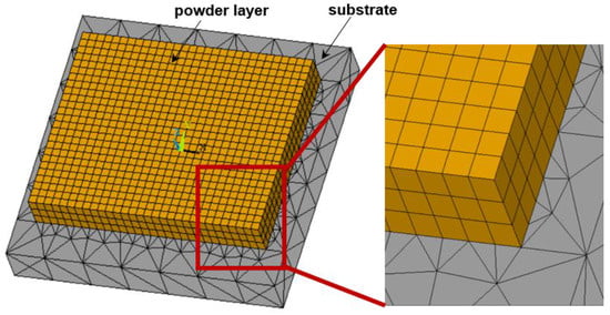 The FEM was developed using ANSYS Mechanical APDL 19.0 Software. employing the element birth and death method. The 3D model consisted of two components: three powder layers with dimensions of 0.6 mm × 0.5 mm × 0.03 mm and a substrate measuring 0.7 mm × 0.7 mm × 0.1 mm. Notably, to enhance efficiency and decrease computational demands, the substrate was fine-meshed only adjacent to the powder bed region and coarse-meshed away from it [29], as shown in Figure 2.