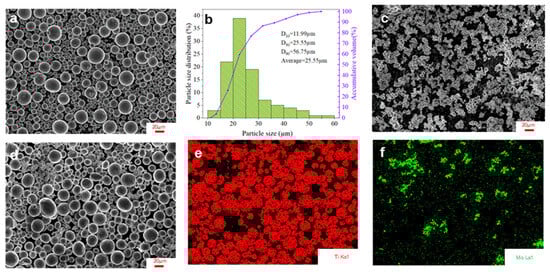 Morphology and composition analysis of the powders: (a,b) SEM micrographs and particle size distributions of pure Ti powders; (c) SEM micrographs of pure Mo powders; (d–f) SEM micrographs and element distributions of Ti-10Mo powder.