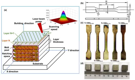 The specific scanning speed and laser power are listed in Table 2. Accordingly, the samples were named Ti-10Mo0.125, Ti-10Mo0.150, Ti-10Mo0.175, Ti-10Mo0.20, and Ti-10Mo0.233 according to the linear laser energy density. The hatch spacing and layer thickness were fixed at 100 μm and 30 μm, respectively. Cubic parts with a dimension of 10 mm × 10 mm × 10 mm for material characterization and specimens for tensile tests were manufactured. The SLM process and as-fabricated samples are shown in Figure 4.
