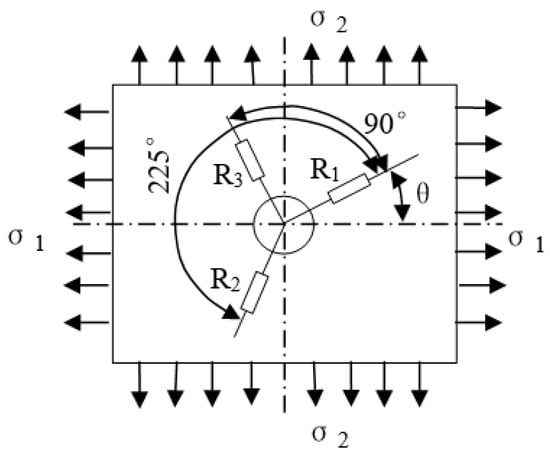 where , , and represent the strain of three different directions; and represent the maximum and minimum principal stress, respectively; θ is the angle between and the reference axis of strain gauge No. 1; E is the elasticity modulus of materials; and and are the release coefficient of strain.