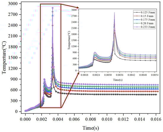 The residual stress in SLM-processed components is primarily thermal stress, indicating its relevance to temperature evolution. To better understand the evolution of the residual stress, the transient thermal history of Ti-10Mo samples prepared at different linear energy densities is shown in Figure 6. It can be noted that the temperature distributions are generally similar across the samples. Each temperature–history profile shows two temperature peaks. The first peak occurs when the laser heat source moves to a position adjacent to the current point, causing the heat generated by the melting powder to transfer to the surrounding area. The second peak is observed when the laser is at the testing point, resulting in the molten pool reaching its highest temperature. Additionally, each profile can be divided into two stages including heating and cooling. The temperature of the molten pool decreases as the laser heat source moves away from the testing point. The peak temperature and the maximum cooling rate obtained by differentiating the temperature curves are listed in Table 3. As linear energy density increases, the temperature gradient also increases, leading to an increment in the maximum cooling rate. Hence, the cooling rate is found to be proportional to the linear energy density.