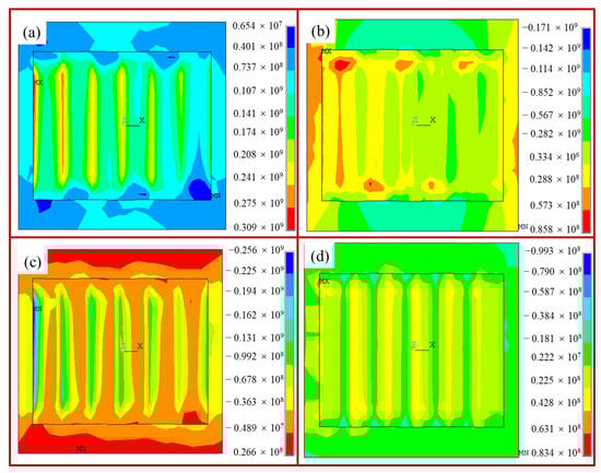 An example of residual stress distribution in the SLM specimen under laser power of 150 W and scanning speed of 1200 mm/s: (a) Von Mises stress; (b) X-direction stress; (c) Y-direction stress; (d) Z-direction stress.