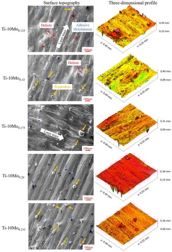 The surface topographies and three-dimensional profiles of SLM-processed Ti-10Mo alloys are shown in Figure 8. When the linear laser energy density is 0.125 J/mm, a small number of pores and irregular flow front adhered with spherical particles can be observed. As the laser power increases or the scanning speed decreases, that is, with the increase in laser energy density, the surface defects are significantly reduced, but the issue of powder adhesion becomes more pronounced. This phenomenon is related to the dynamic viscosity of a molten pool [30], as defined in Equation (11)