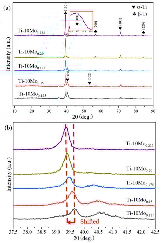 Figure 9 shows the XRD patterns of the SLM-processed Ti-10Mo alloys under various linear energy densities. The distinct diffraction peaks indicate that the SLM-processed Ti-10Mo alloys comprise a mixed phase of hexagonal close-packed (hcp) α-Ti and body-centered cubic (bcc) β-Ti at room temperature, with α-Ti exhibiting higher intensity. However, the diffraction peaks corresponding to the pure Mo phase are absent in all five samples, which aligns with the findings of Xie et al. and Kang et al. [31,32]. As Mo serves as a significant β-stabilizer, the critical cooling rate required to retain the β phase is reduced, and the transformation from the β to α′ phase is suppressed by lowering the martensitic starting temperature. This results in the retention of the bcc β-Ti structure during the rapid cooling and solidification of the SLM process [20,23]. As the linear laser energy density increases from 0.125 to 0.233 J/mm, the peaks corresponding to the β phase increase slightly, while the diffraction peaks of the α phase exhibit a slight reduction. This phenomenon can be explained by the fact that the β-stabilizer Mo particles were more sufficiently melted with the increasing laser energy density. On the one hand, the concentration of Mo particles could be below the detection limit of X-ray diffraction, which is sensitive primarily to crystalline phases. On the other hand, the size and distribution of the Mo particles might affect their visibility in the XRD analysis. Smaller particles or those in an amorphous state may not produce distinct diffraction peaks. Hence, Mo particles are not visualized at the XRD spectra. Additionally, in theory, due to the high cooling rate of the SLM process, the lattice stress increases, leading to a higher 2θ location. However, the 2θ angles of the diffraction peaks are slightly left-shifted according to the local view shown in Figure 9b. This shift can be attributed to the larger atomic radius of Mo compared to that of Ti. Consequently, the increased presence of Mo particles as substitutional atoms leads to an expansion of the lattice constant of the Ti matrix. Bragg’s law is described in Equation (12),