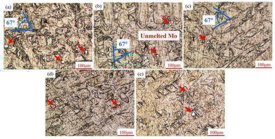 The etched microstructures of SLM-processed Ti-10Mo alloys are depicted in Figure 10. It is noted that the angle between the two layers of laser traces is observed to be approximately 67°, aligning with the designed scanning strategy outlined in the experimental section. Meanwhile, samples prepared with low laser energy input exhibit a heterogeneous conchoidal microstructure, as illustrated in Figure 10a–c. With increasing linear energy density, the higher laser energy input leads to the remelting of the melt trace. Consequently, the dissolution of the heterogeneous conchoidal microstructure can be observed, as presented in Figure 10d,e. Furthermore, it is worth noting that some unmelted or partially melted Mo powder particles are randomly distributed along the boundary of the melt trace. This phenomenon can be attributed to the high melting point of Mo (2380 °C), which causes the Mo particles to remain partially melted while the Ti particles are fully fused under a high-energy laser beam. Consequently, solid Mo was driven by the stirring effect of Marangoni flow within the molten pool, resulting in the accumulation of Mo at the boundary of the melt trace during the SLM process. As demonstrated in Figure 11, some unmelted or partially melted Mo powder particles can be detected in the EDS results.