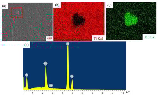 EDS results of Ti-10Mo0.233 sample: (a) SEM micrographs; (b,c) mapping distribution of Ti and Mo elements (the corresponding region marked with red dotted frame in (a)); (d) EDS spectrum.