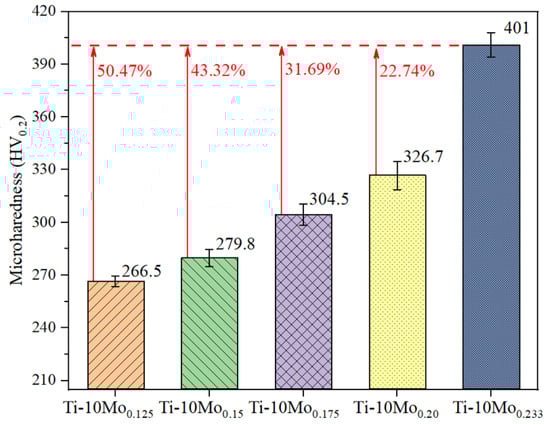 The microhardness of different SLM-processed Ti-Mo samples is shown in Figure 12. At an energy input of 0.125 J/m, the microhardness is 266.5 HV0.2, attributed to the presence of large voids resulting from incomplete powder melting. It can be concluded that high linear laser energy density correlates with increased microhardness, consistent with the trend observed in the relative density of the samples (Table 4). Once the linear energy density is up to 0.233 J/mm, the sample exhibits the highest microhardness with the value of 401HV0.2, which is 50.47%, 43.32%, 31.69%, and 22.74% higher than that of the Ti-10Mo0.125, Ti-10Mo0.150, Ti-10Mo0.175, and Ti-10Mo0.2 samples, respectively. From the XRD results, it can be found that the peaks of the β phase increase slightly, while those of the α phase exhibit a minor weakening with the increasing laser energy density. Nevertheless, the differences in the quantities of α-Ti and β-Ti are not significantly distinct. Accordingly, the differences in porosity and the Mo particle content within the samples synergistically lead to the variation in microhardness.