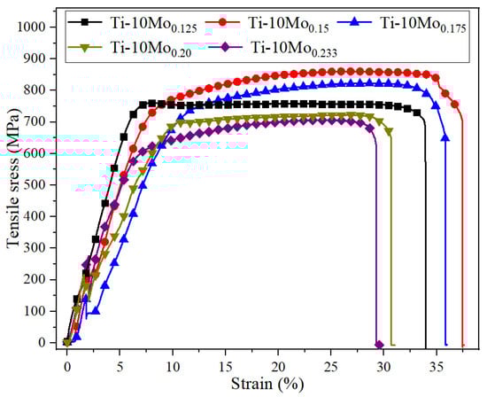 Figure 13 shows the stress–strain curves of SLM-processed Ti-10Mo alloys at various laser energy densities, with the detailed results summarized in Table 6. When the linear energy density is 0.150 J/mm, the ultimate tensile strength (UTS) and yield strength (YS) reach the peak values of 860 MPa and 752 MPa, respectively, with an elongation of 32.9%. With the decrease or increase in the linear energy density from this value, both the UTS and YS decrease, implying that there exists an optimal value of linear laser energy density that can improve the tensile properties of SLM-processed Ti-10Mo alloys. As the linear laser energy density increases to 0.233 J/mm, the SLM-processed Ti-10Mo alloys present the lowest UTS of 706 MPa and the elongation decreases to 25.6%, which are 17.9% and 22.2% lower than those of Ti-10Mo0.150. The UTS order of SLM-processed Ti-10Mo alloys at room temperature is Ti-10Mo0.150 > Ti-10Mo0.175 > Ti-10Mo0.125 > Ti-10Mo0.20 > Ti-10Mo0.233. Specifically, except for the Ti-10Mo0.125 sample, the variation trend of UTS is negatively correlated with the linear laser energy density, while microhardness shows a positive correlation with linear energy density. In other words, the higher the hardness value, the lower the UTS value. The highly concentrated energy input of the SLM process and the characteristics of layer-by-layer scanning create an excessive thermal gradient, resulting in high residual stress that significantly limits tensile performance. Furthermore, the dissolution of molybdenum is also a crucial factor that cannot be ignored. As the linear laser energy density increases, the melted molybdenum element significantly influences the microstructure size and phase transition, a finding that is further verified in the XRD pattern results.