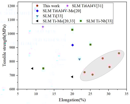 Figure 14 compares the UTS and elongation of SLM-processed Ti-10Mo alloys from this study with those of binary titanium alloys reported by others. The as-built Ti-10Mo alloys in this work show nearly no difference in the UTS values compared to those of SLM-processed Ti-Mo alloys in other research. Nevertheless, the elongation values surpass those of most previously reported SLM-fabricated titanium alloys, indicating that the as-built Ti-10Mo alloys in this work exhibit significantly greater ductility.