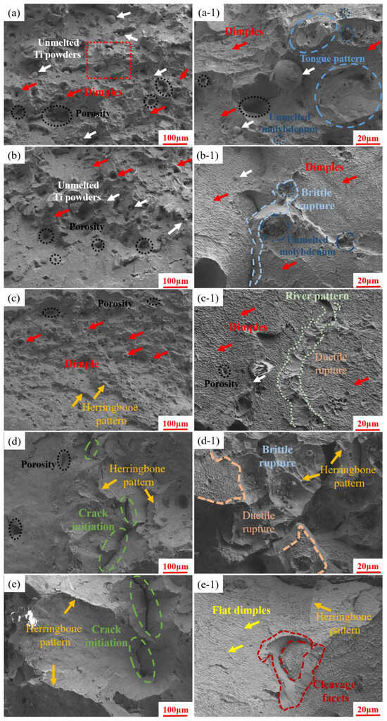 Tensile fracture morphologies of different samples: (a,a-1) Ti-10Mo0.125, (b,b-1) Ti-10Mo0.150, (c,c-1) Ti-10Mo0.175, (d,d-1) Ti-10Mo0.20, and (e,e-1) Ti-10Mo0.233.