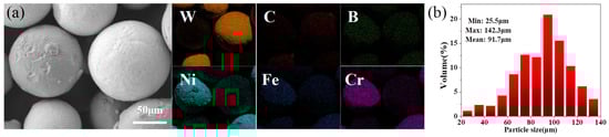 The laser cladding substrate is 1Cr13 (Junchu Iron and Steel Co., Ltd., Liaocheng, China). The dimensions are 60 × 60 × 15 mm. The powder materials of the cladding layer are Ni65A powder and WC powder. The particle size is 45 to 150 microns, provided by Xinsheng Alloy R&D Laboratory (Xingtai, China). The chemical composition of the substrate and Ni60A powder is shown in Table 1. The Ni65A powder and WC powder were weighed with a mass ratio of 6:4 and put into a ball mill for ball grinding. The mass ratio of ball to composite powder is 2:1. Finally, they were subjected to forward and reverse rotation for 1 h each. In order to reduce the moisture in the composite powder, the composite powder is heated in a drying furnace to 100 °C for 1 h. The morphology and distribution histogram of the composite powder material after ball milling is shown in Figure 1.