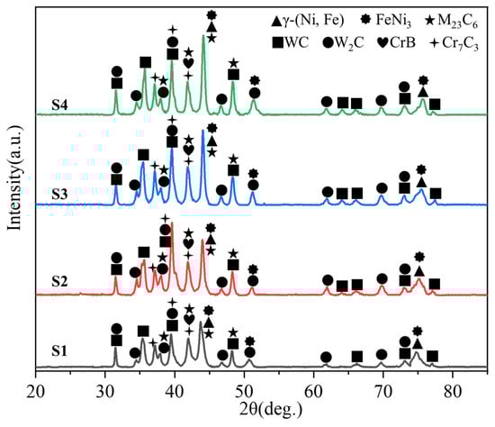 From the tissue evolution pattern of the coatings under different power conditions, it can be seen that the S1 specimen (800 W) failed to fully dissolve the reinforcing phase due to the insufficient melting pool temperature. The organisation of the coating is coarse and unevenly distributed, with pores at the top. The enhanced phase precipitation in the middle is uneven. The bottom bonding interface is poor, resulting in the lowest coating performance. Under S2 (1200 W) conditions, the melt pool temperature is moderate. The reinforcing phase is partially dissolved and uniformly distributed, forming fine equiaxial crystals, flower-like grains, and neat columnar crystals. The tissue densification was high and the properties were significantly improved. S3 (1600 W) further increased the melt pool temperature, and the reinforcing phase was completely dissolved and re-precipitated to form reinforcing particles, and the grains were significantly refined. The top, middle and bottom of this coating show excellent densification and homogeneity. S4 (2000 W), on the other hand, has a high melt pool temperature, resulting in grain coarsening, cracks and interface defects. The reinforcing phase was not redistributed after decomposition, and the densification and homogeneity of the coating decreased significantly, which resulted in the worst performance.