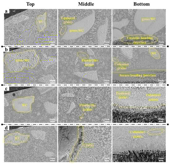 Figure 3 demonstrates the microstructure of the coating cross-section of the Ni65A/WC composite at different laser powers. As can be seen from the figure, the temperature of the molten pool in the top region is lower under the 800 W power condition. As a result, the reinforcing phase WC particles were not sufficiently dissolved in the pool melt and most of the particles were precipitated in the lower and middle layers of the coating. Due to the shortage of energy, the equiaxed crystals at the top are coarser, and the grain boundaries are indistinct. The particles were not uniformly distributed and high porosity was present. This phenomenon may be due to the poor fluidity of the melt pool, and the reinforcing phase could not be sufficiently diffused and uniformly distributed in the coating. The flower-like grains in the central region are sparsely distributed and have irregular grain boundaries. The reinforcing phase particles are partially concentrated in certain localised areas and the metallurgical bond with the substrate is weak. Under low-power conditions, the melt pool temperature is inadequate to provide sufficient driving force for redistributing the reinforcing phases. This resulted in the formation of significant inhomogeneities in the microstructure. The columnar crystals at the bottom are loosely arranged, and the grain size is large and without obvious direction. Since the reinforcing phase particles are mostly deposited in the bottom region, WC has a weak bonding interface with the substrate and cannot form a continuous and dense metallurgical bond [30]. This indicates that the utilisation efficiency of the reinforcing phase is very low, and the mechanical properties of the coating are significantly limited under low-power conditions.