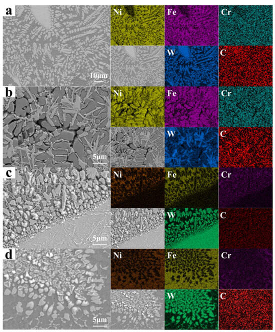 Under the 800 W power condition (Figure 4), the insufficient melting pool temperature resulted in the formation of a clear dendritic structure of the coating, with coarse and strongly orientated grains. At the same time, the reinforcing phase WC particles were not sufficiently dissolved and exhibited deposition. The SEM morphology shows that the coating structure is rough and the reinforcing phase is not fully integrated with the substrate, resulting in poor overall densification. This leads to overall poor densification. Elemental distribution analysis shows that Ni and Fe are uniformly distributed as matrix elements. However, W and C in the reinforced phase show uneven distribution with high local concentrations. This indicates that the WC particles are not fully involved in the metallurgical reaction. In addition, the Cr element may have a slight enrichment phenomenon at the grain boundary. The insufficiency under low power conditions resulted in a coarsened and weakly bonded coating organisation, which is presumed to have poor mechanical properties. In particular, the hardness and wear resistance were poor. At 1200 W power with moderate melt pool temperature, the coating organisation was significantly optimised. It is primarily characterised by fine equiaxed crystals with uniform and regular grain arrangement. The reinforcing phase WC particles were partially dissolved and redistributed in the coating and were evenly dispersed inside the coating, which significantly improved the densification of the coating. SEM morphology showed that the surface of the coating was homogeneous with no obvious defects, and the reinforcing phase was well bonded with the substrate. The elemental distribution results show that Ni and Fe are stably and uniformly distributed, while W and C are also uniformly dispersed. The elemental distribution of Cr is stable and there is no grain boundary enrichment phenomenon. The results showed the optimisation of enhanced phase distribution and the enhancement of tissue densification under medium power conditions. The coating showed excellent performance in terms of hardness, wear resistance, and interfacial bond strength.