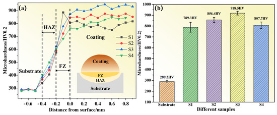 Hardness map of the coating cross-section: (a) microhardness distribution and (b) average microhardness.