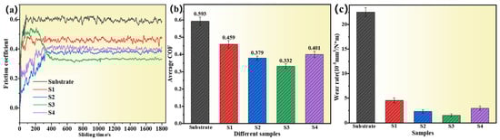 By analysing the sliding wear curves and the average coefficient of friction (COF) data during the static wear stabilisation stage for different specimens (S1, S2, S3, and S4) shown in Figure 6, the effect of different laser power conditions on the wear resistance of the composite coatings can be deduced. Under the 800 W power condition, the molten pool temperature was insufficient, resulting in poor densification and homogeneity of the coating organisation. The reinforcing phase WC particles failed to dissolve sufficiently and showed local aggregation, with defects such as pores or microcracks potentially present in the coating. During the sliding wear process, the friction coefficient of S1 fluctuated initially and, after entering the stabilisation stage, remained at 0.459. Compared with the substrate (0.593), the friction coefficient was reduced. However, the enhancement was limited, and the wear process was less stable and showed a higher wear rate. The average coefficient of friction for static wear further verifies the limited improvement in wear resistance of S1. The poor performance was primarily due to the low power conditions failing to provide sufficient melt pool mobility and heat for the uniform dispersion of reinforcing phase particles. At 1200 W, the microstructure of the coating was significantly optimised, with the reinforcement phase WC particles partially dissolved and uniformly dispersed. Improved metallurgical bonding and reinforcing phases formed, and the densification and homogeneity of the coating were significantly enhanced. During the sliding wear process, the friction coefficient of S2 was significantly reduced to 0.379 and showed good curve stability, and the wear resistance of the coating was significantly enhanced. The static wear data showed a lower average coefficient of friction for S2. This indicates that the coating is optimised by the dissolution, uniform distribution, and microstructure densification of the enhanced phases under medium power conditions. A significant improvement in wear resistance was achieved. Thanks to the moderate melt pool temperature and uniform distribution of reinforcing phases, S2 exhibits excellent wear resistance. Friction and material loss were significantly reduced. It is one of the more desirable coatings in terms of performance.