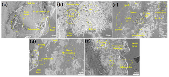 Figure 7 demonstrates the SEM images of different specimens after friction. The matrix material shows significant adhesive wear and plastic deformation during the friction process. This indicates that the wear resistance is extremely poor, and the surface material is shed on a large scale due to the local stress concentration during the wear process. The oxide layer is weak and unable to form effective protection at high temperatures. The fusion coating at 800 W power has limited densification and uniformity due to the insufficient melt pool temperature. Significant delamination, grooves, and flaking pits occurred, and the oxide layer was discontinuous. Although the performance was slightly improved compared to the substrate, it was still insufficient to effectively improve the wear resistance. The organisational homogeneity and densification of the coatings were significantly improved at 1200 W power. The distribution of reinforcing phases was more uniform. The surface wear characteristics were dominated by shallow grooves and a few abrasive particles. At the same time, a continuous oxide layer is formed as a protective barrier, which significantly improves the wear resistance. The melt coating exhibits optimal performance and forms the densest structure when the reinforcing phase is fully dissolved and precipitated at a laser power of 1600 W. Slight abrasive wear is dominant on the surface, and the oxide layer is uniform and stable, effectively protecting the coating material. Excellent wear resistance was demonstrated. However, due to the high melt pool temperature at 2000 W, the coating organisation was coarsened and the densification decreased. With the discontinuity of the oxide layer, cracks and delamination phenomena increased significantly, leading to the deterioration of the wear resistance of the coating, which was manifested by more abrasive particles and spalling pits.
