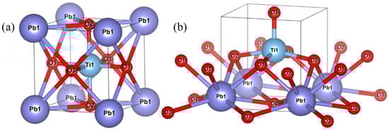 In this study, we concentrate on the cubic and tetragonal phases of Pb(ZrxTi1−x)O3. Models are developed based on the virtual crystal approximation (VCA) theory. The modeling of different doping concentrations of Pb(ZrxTi1−x)O3 is achieved by varying the atomic ratio of Zr to Ti. For instance, in Pb(Zr0.1Ti0.9)O3, the Zr content is 10%, and the Ti content is 90%, resulting in a doping concentration of 10%. This approach allows for the co-occupation of a single atomic site by Zr and Ti in any specified proportion. This approach has been validated for computational investigations into the composition and properties of these materials [32]. The cubic and tetragonal phases of PbTiO3 are illustrated in Figure 1.
