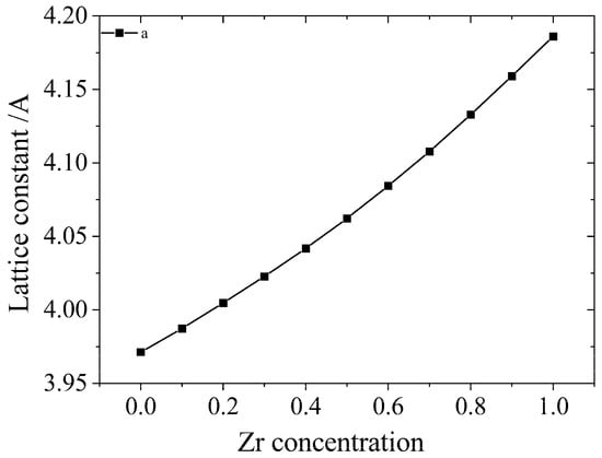 Table 1 shows the results of lattice constants of Pb(ZrxTi1−x)O3 in cubic and tetragonal phases. It can be seen that the calculated lattice constants are in good agreement with the experimental values, indicating that the virtual crystal approximation method as well as the calculation parameter settings are of good applicability. Following this, we carried out calculations of this work based on the lattice constants. The relationship between the lattice constant and Zr content of the cubic phase Pb(ZrxTi1–x)O3 is shown in Figure 2, which shows that the lattice constant a increases gradually with the increase in Zr content, and the change in the lattice constant satisfies the first-order Vegard’s law.